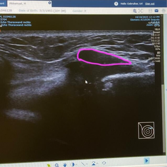 Het was woensdag 18 oktober. Op naar Monro. Kleine Dayn ging mee, want de laatste afspraak was ik daar hoogzwanger en zei ze dat ik de volgende keer de baby mee moest nemen. Zo gezegd, zo gedaan. Zijn eerste lange rit werd het ziekenhuis. Sanne, mijn vriendin was mee, dat hadden we ver voor de afspraak al afgesproken. Zo kon Remco gewoon lekker mais blijven hakselen. De afspraak was met mijn oncologisch chirurg. Zij deed het lichamelijk onderzoek en begon zoals ze altijd begon om te kijken of het haar zo zou opvallen. Toen ze goed ging voelen dacht ze eerst aan opgezette rib aanhechting. Een echo moest duidelijkheid geven. Jammer genoeg gaf het dat niet. Er was wel een massa te zien, maar het kon van alles zijn. De radioloog zei dat een goedaardig gezwel direct te zien zou zijn, en dat was hier niet te zien. Maar het kon wel verder van alles zijn. Het was niet direct misse boel.. Op de foto's zie je hoe het eruit ziet. Het roze lijntje geeft aan wat de verdikking is.